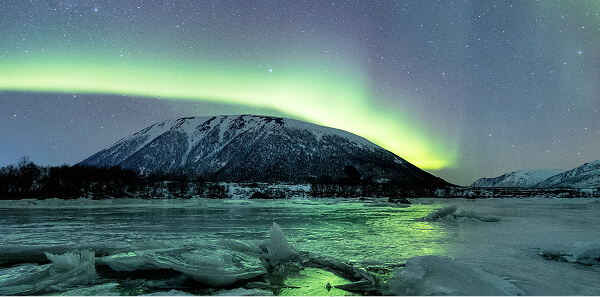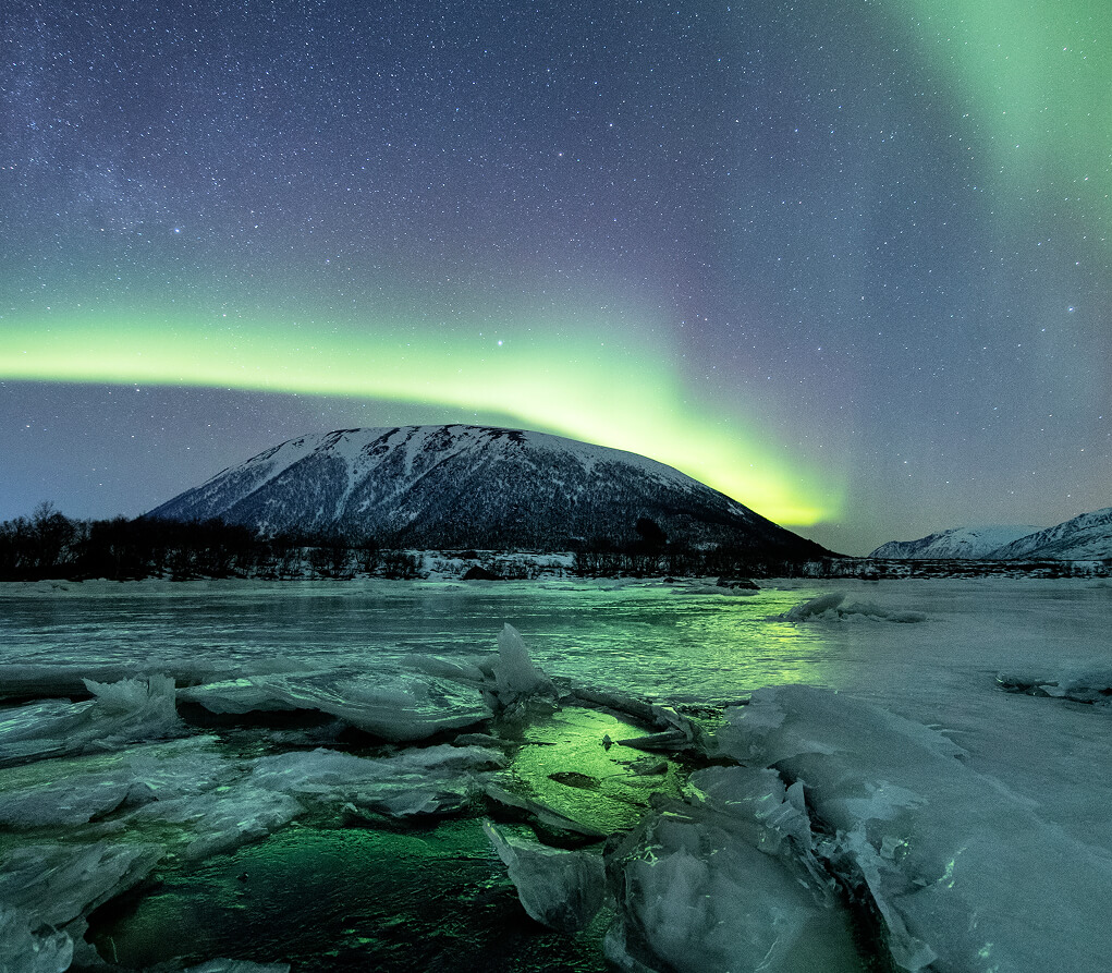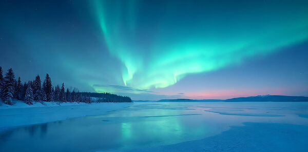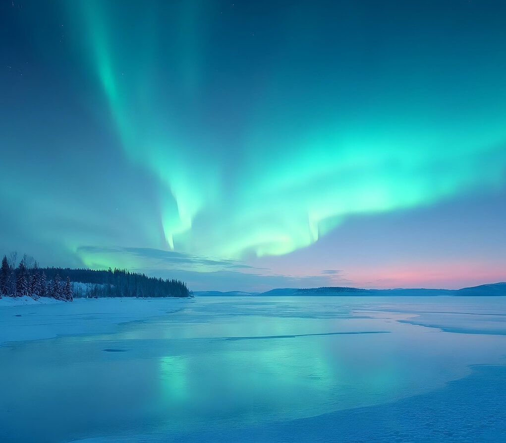 Удивительное световое шоу происходит в ночных небесах северных широт, когда частицы солнечного ветра взаимодействуют с магнитным полем Земли, создавая яркие, переливающиеся волны света в оттенках зеленого, синего, фиолетового и розового.